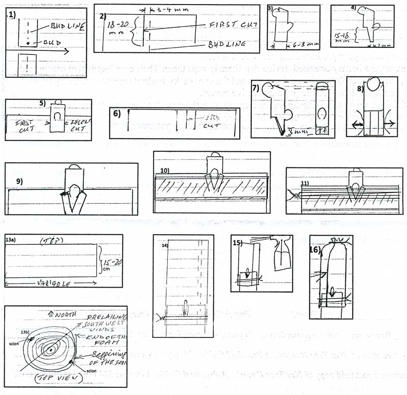Vigorous grown scion wood preferably pencil size diameter with well spaced buds has to be collected mid March when it is fully dormant and stored in plastic in the refrigerator until early May when the grafting season begins.