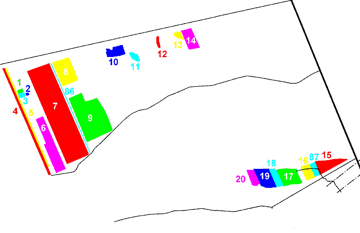 | 86 | white & blue spruce: planted at 2 m spacing, in a double row the southern third, 90% survival, 17 cm DBH, 7 m tall |