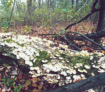 | Fungi are an essential part of forest ecology. They recycle old trees into nutrients for new ones. Since this forest is so young, there are few places where you can see them in action. Everything cleared for the trail was placed on the forest floor near by, to promote a healthy forest ecology for the future. |