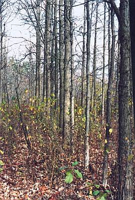 The bur oak on the ridge are beginning to thin themselves. In another 20 years, there will be successful trees at an average of 6 m spacing; the smaller trees will lose the battle for survival. |