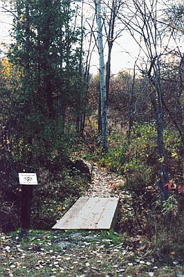 | One of the few cedars not cut for fencing and a bridge mark the north access to the trail where it crosses an old farming road. |
