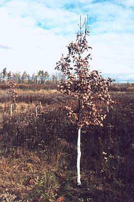 | Voles killed many of the red oak planted in the clay of the valley floor. The remaining trees are not growing well because they don't like the wet heavy soil. |
