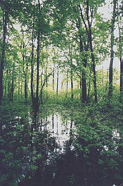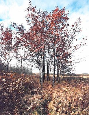 For about a hundred years, until the 1960's, the area was mostly plowed farmland. The west end of the trail, on the sand ridge, passes through trees that were left along the edges of farmers' fields and spread rapidly by windblown seeds, primarily birch and red maple. |
