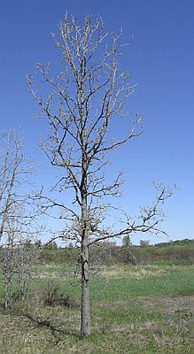 | The bur oak here on the clay are growing more evenly than those on the sand of the ridge. This tree displays the ruggedly twiggy form of fine bur oak. |