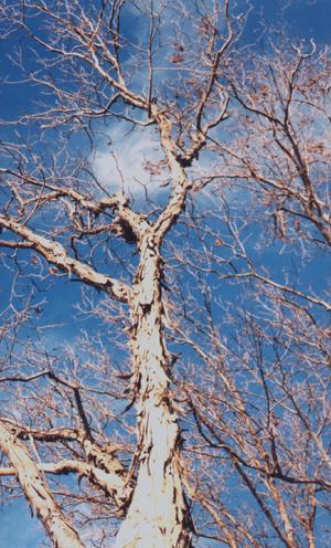 | The bark of several of the trees most exposed to the river wind has been abraded so much that no shag is left |