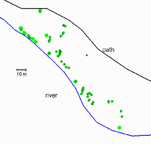 | There are 70 mature trunks, the largest 50 cm DBH. 10 trees are double-stem, 1 triple. About ten set seed in 2001. There are many smaller trees around most of them, from seedling size up to 2 m tall. Light green marks trees >40 cm DBH; medium green, 20-40 cm; dark green, 10-20 cm. The soil throughout is gritty sand and gravel so drainage is nearly perfect, but the adjacent river ensures that adequate moisture is always available to tap roots. |