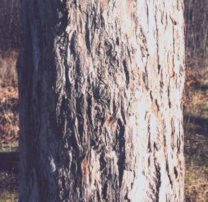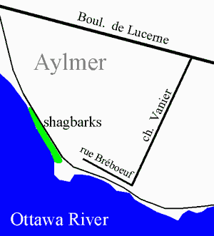 | Until a few years ago, these shagbark hickory (Carya ovata), located on the north shore of the Ottawa River just upstream from the Deschênes rapids at 45°23'N 75°49'W, were believed to be the most northerly-climate naturally-reproducing population of their species in the world. They are growing half a zone north of their normal range, and exposed to the full blast of winter winds across the river. |