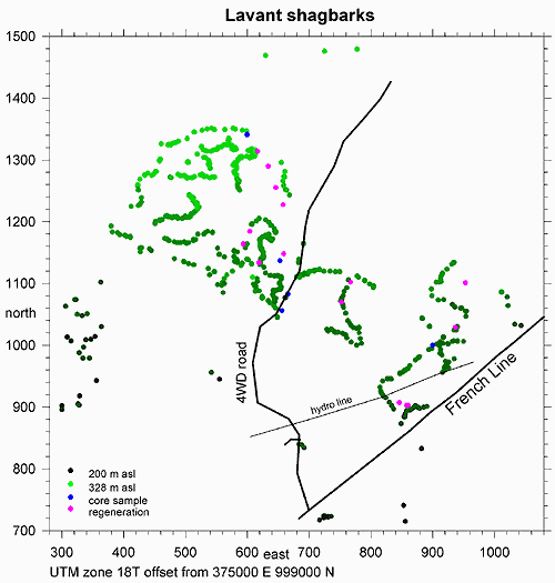 Since the native range of the main population of C.ovata stops just north of the St. Lawrence River, and due to other differences from main population trees, the consensus of experts is that these trees should be considered as a subspecies of shagbark: we have informally named it C.ovata lavanti. They are believed to be the most northerly-climate naturally-reproducing population of their species in the world. They are extraordinary trees, growing right up to the tops of the most exposed, driest rocky ridges. The Clyde River was a well known canoe route of the Algonkians, and it is possible that these trees are descendants of some planted by them. Their distribution suggests an origin prior to the mini-ice age centered on 1500 AD. Young trees are scarce, limited to a few areas where their seed has washed down from higher trees (in pink on the map below).