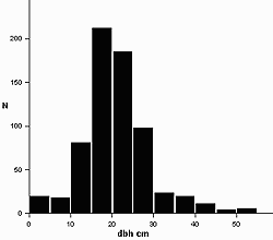 | distribution of DBH (diameter at breast height). 578 trees: 71 double trunk, 11 triple trunk, 2 5-trunked. |