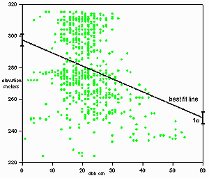| correlation of DBH with elevation: larger trees tend to be at lower elevations. |