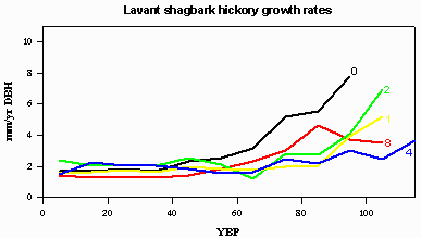| Growth rate (10 year averages) of five typical trees, at breast height, covering the range of altitude at the site. Their locations are shown on the survey map in blue; numbering is from low altitude to high. All the trees are very close to the same age. It seems that there was a clearcut in the 1880's and that the resulting site conditions strongly favoured shagbark regeneration. There is also evidence that shagbarks were selected over other species. One selection must have taken place long enough ago that the downed trees have decomposed. A second involved the removal of ironwood approximately 1985. |