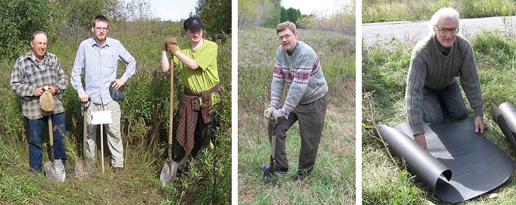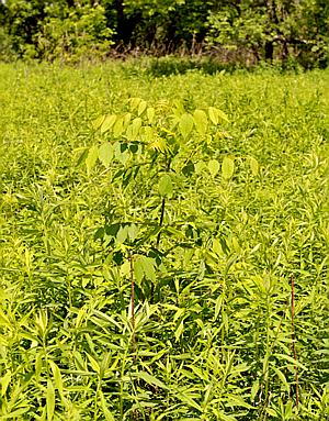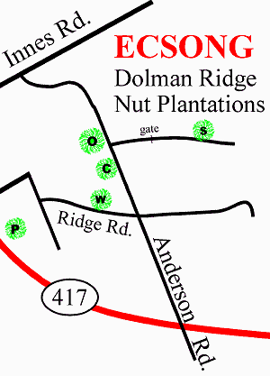To preserve the C.ovata lavanti genome, nuts have been collected from the site for several years. Some were planted in back yards in Ottawa and Lanark, most given to the Ferguson Forest Center in Kemptville to grow and distribute to areas north of the main range of the species. Dolman RidgeThe spring of 2005, 100 of the 2003 crop in peat pots from Ferguson, and 8 of the 2002 crop raised in Ottawa, were planted out on a site provided by the National Capital Commission along the restricted access portion of the Dolman Ridge Road. (S at right. An NCC access permit is required for vehicular access; foot access is from the Dewberry Trail parking lot at the gate.) It is isolated from existing hickory populations by at least a kilometer. The soil is sandy and well drained. They were surrounded with a meter-square roofing paper ground cover to suppress competition, as shown at right. This usually permits an 90% survival of tap-rooted seedlings planted in meadows here, where goldenrod and asters reach a meter in height. It also permits the seedlings to be found in early years. (Commercial plantings use Simazine, a pre-emergent herbicide, for this purpose. Since this is a Ramsar conservation area, no toxic substances are permitted.) The paper is removed once the trees rise above the surrounding forbes. In any case, it has been found to almost completely disintegrate on its own within 10 years when in contact with soil.The ultimate aim was to have a reserve population approximately equal in size to the original at Lavant. The first weekend after planting was completed, a vandal uprooted and destroyed a dozen of the seedlings nearest the road, including half of the home-grown plants. After signs were posted noting that this was a research planting, and chats with regular dog walkers in the area about the importance of the planting, the vandalism ceased. Then, it turned out that the roots of all the Ferguson trees had been killed over the winter before planting. Solely 4 of the 8 transplanted bare root survived. The fall of 2005, 120 seedlings from the 2003 crop, grown by Len Collett of Lanark, were planted. They were mixed in one area with 15 bear oak (Quercus illicifolia) grown from seed obtained from Tamworth ON, in another with 30 white oak (Quercus alba) grown from seed from trees on the Dolman Ridge, in another with 10 American chestnut (Castanea dentata) also grown from seed from trees on the Dolman Ridge. Other suitable species will be interplanted later, once the pattern of survival of the shagbarks is determined. The aim is to have the plantation half shagbark, half other compatible species, the ratio found at the Lavant site. By late spring 2006, up to half of the seedlings appeared to be dead from stem rot. It seems that these shagbarks are much more susceptible to rot over winter than are shagbarks from the main population range. So, the paper was ripped back several centimeters from the trunks of all of them to ensure adequate water drainage and ventilation, even though this reduced the effectiveness of the paper in suppressing competition. This experience suggests that the failure of the Ferguson seedlings was due to excessive root moisture. The seedlings certainly had not dried out (a common problem with plants in peat pots) as they were covered by healthy moss when received. Overall survival by spring 2007 since planting of the shagbarks was about 30% (excluding the Ferguson trees and those destroyed by the vandal). It is difficult to make a precise survey as they leaf out well after the surrounding forbes which exceed them in height by that time. Growth is very slow, due to the lack of light, but the surviving trees were in good health. 180 viable seeds were collected by Len Collett in the fall of 2008. For the first time in years, no red squirrel got around to dropping the seed of one Lavant tree until mid-September. Half were planted immediately in situ in the frozen earth; the remainder were put in a frig for stratification. The spring of 2009 was devastating - a prolonged early warm spell broken by a sharp frost on 12 April that affected many trees in the area. Only 15 surviving shagbarks were found. A good crop of Lavant nuts was collected fall 2011; 200 were planted throughout the plot. |