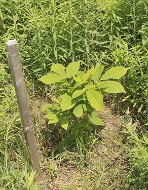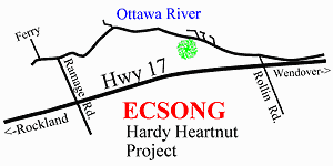 WendoverIn the fall of 2009, a dozen Lavant shagbarks were planted at the organic farm of Gordon Wilkinson, where ECSONG's Hardy Heartnut Project is located. There are no squirrels on the site, and almost no voles, so no protection was used. Five survived the winter and subsequent dry spring, the others were replaced fall 2010.