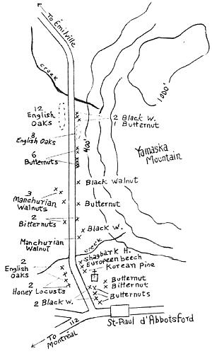 À environ 1 heure à l'est der Montréal, tout près de la municipalité de St-Paul d'Abbotsford, autrefois appelé le rang des Anglais, le rang de la montagne longe le mont Yamaska et est bordé d'arbres introduits et à noix d'une façon si rapprochés dans son ensemble qu'il forme un tout à part du reste de la région. La population anglophone depuis plusieurs générations explique cela par un intérêt vis à vis l'arbre et sa conservation, particulièrement les arbres nobles comme ceux qui nous intéressent.