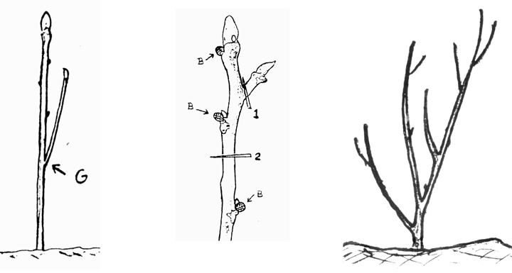 | jeune semis de 2 ans dont il faut éliminer un gourmand (G). | Rameau portant des chatons en dormance (fleurs mâles) qui s'écloront en fin mai (B). 1 . bonne coupe 2 . mauvaise coupe | Noyer d'environ 5 ans que des gelures ont déformé la structure. Fréquent avec les individus peu rustiques. |