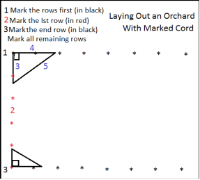 - Then lay out the first tree row at right angles to the base line ensuring that it is straight and true. The "3,4,5" triangle or multiples of this form can be used to create a 90 degree angle for your tree row.