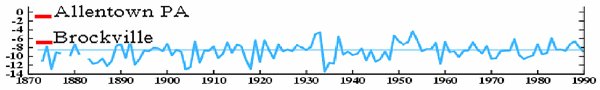 The horizontal line at -8.4 °F is the mean of the data for Ottawa. For comparison, the equivalent mean is shown for Brockville, and for Allentown PA.