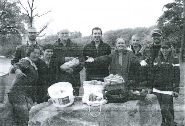 Craig, Tricia, Alicia, John Sankey, Jay Garlough and Joanne Butler, Tony, Marc, and Krista, all volunteer walnut harvesters, gathering walnuts for Ottawa's Hidden Harvest program. Photo by: Katrina Siks