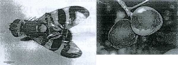 2014 was a bad year for this walnut pest Rhagoletis completa. It looks like the common house fly but wing stripes and the yellow dot between the wings is an identifying marker. It is a common pest of the black walnut and is found throughout its range. This fly has one generation per year. Walnut husk flies overwinter as pupae in the soil and emerge as adults in some areas as early as May but generally around July 1. Peak emergence often occurs late July j through August.
