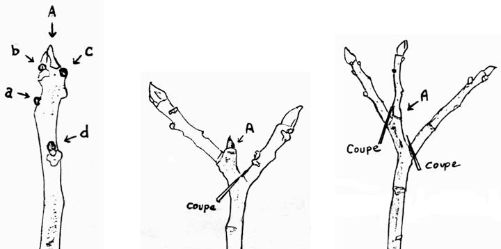 a, b, c et d sont les bourgeons successibles de produire les nouvelles tiges si le bourgeon terminal (A) péri par gelure. | 2 rameaux ont émergé après la perte du bourgeon terminal (A). Un seuldoit être conservé. | 3 rameaux ont émergé dû à une trop faible croissance après la plantation. 2 tiges seront éliminés. |